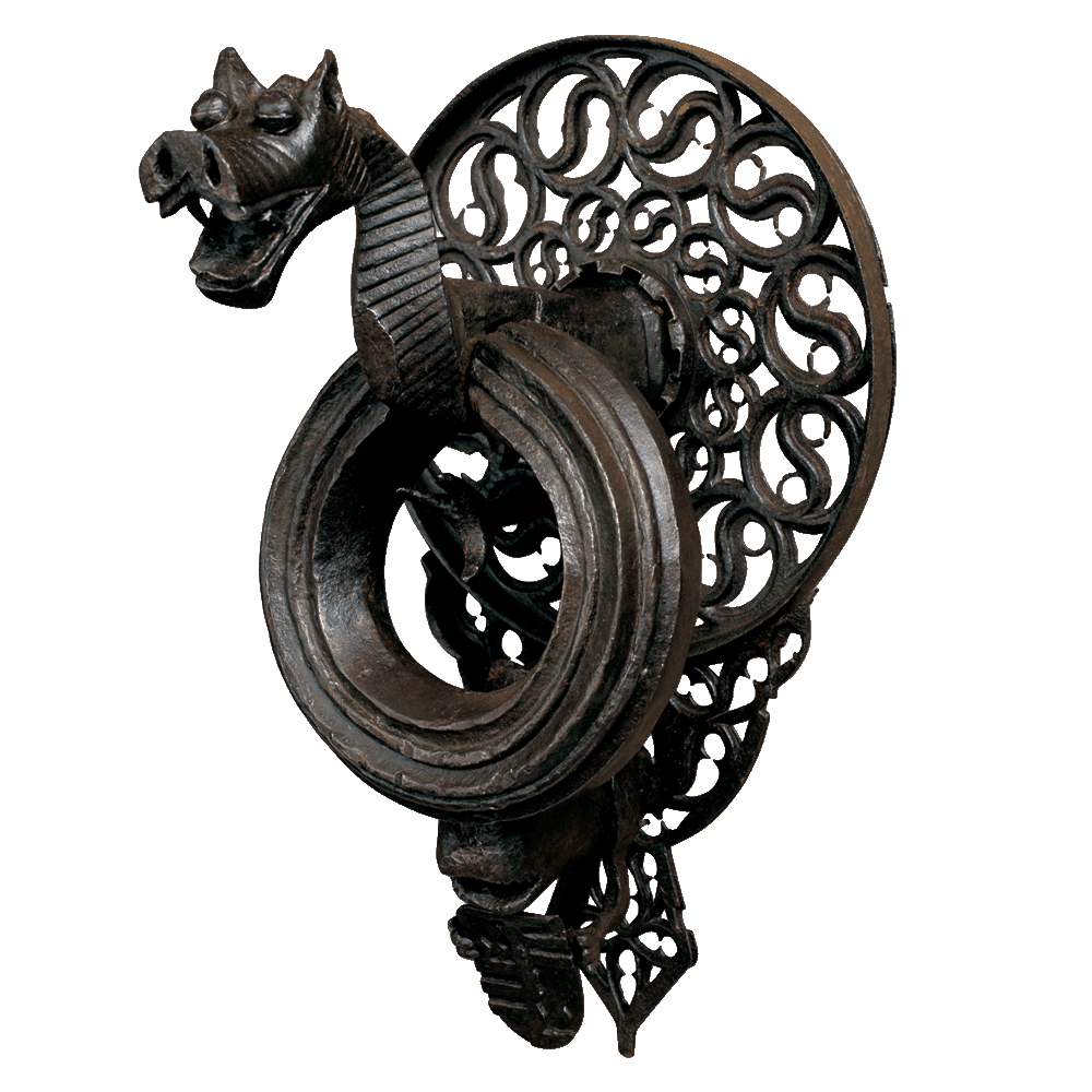 El drac, símbol per antonomàsia del mal, apareix sovint com a representació del dimoni i personificació del mal. En aquest cas, un drac ferotge, amb esmolades dents i urpes, protegia i donava entrada a la Casa de l’Ardiaca de Barcelona a finals del segle XV. Es tracta d’un picaporta d’anella amb placa calada que avui es conserva al Museu del Cau Ferrat de Sitges, que aplega una de les col·leccions més singulars i riques centrades en l’art del ferro. La forja ha estat una de les manifestacions més remarcables dins de les arts de l’objecte a casa nostra: a tall d’exemple, la reixa de la catedral de Notre-Dame de París la realitzaren dos mestres forjadors catalans, Blay i Sunyol, cap al 1250.