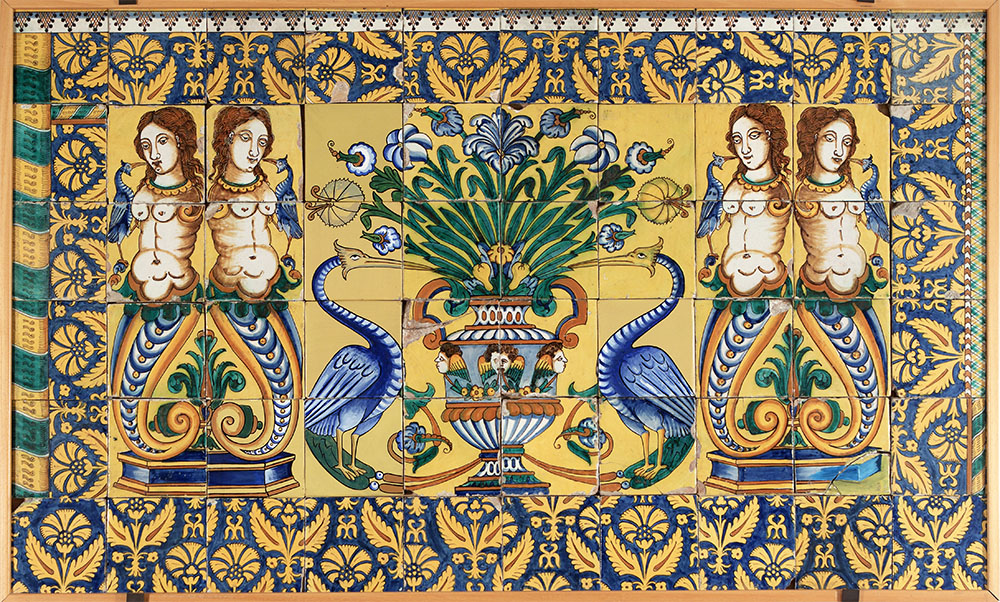 Tot i que el repertori i l’èxit del llenguatge grotesc es veu frenat per la Contrareforma, contrària a la seva extravagància decorativa, aquest perdurarà en els centres artístics de la perifèria i en les arts de l’objecte. És el cas del plafó de les sirenes que beu de l’antic repertori de gravats amb estípits i cariàtides propis del cinc-cents. Aquest conjunt de rajoles policromes, avui al Museu d’Art de Girona, formava part dels revestiments murals de la capella del Roser de l’església de Sant Martí de Llaneres. Curiosament, és un motiu plenament profà, amb cariàtides i ocells fantasiosos que es presenten com si es tractés d’un frontal d’altar.