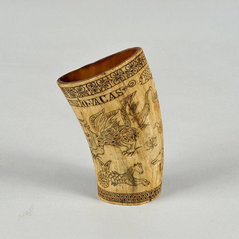 Animal silvestre. El corn o la banya ha tingut moltes utilitats des de la prehistòria, com a estri quotidià i suport plàstic. El present got, tradicionalment anomenat “de pastor”, presenta una decoració horror vacui d’ocells, insectes, peixos i animals fantàstics, com l’hipocamp, una criatura mitològica amb tronc de cavall i potes posteriors convertides en cua de peix, i l’anomenada en romanços catalans del XVIII i XIX “Animal Silvestre” i, a la resta de la península, “Fiera Corrupia”. Fou una variant de la Quimera, apareguda a l’antiga Grècia al segle VII aC. Segons un exemplar imprès a Barcelona del 1726, la bèstia va aparèixer a la ciutat de Jerusalem i va atemorir la població, devastant pobles sencers i menjant-se els seus ramats. Al llarg del segle XIX i principis del XX, altres romanços s’imprimiran amb el mateix text i amb diferents versions xilogràfiques. Aquesta literatura de canya i cordill fou la font iconogràfica del got propietat d’“Antonio Vacas”.