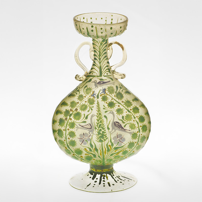 Fràgil com un ocell. Ampolla de vidre esmaltat de producció catalana, decorada amb formes vegetals i animals, amb el seu característic color verd. L’aplicació de pigments permetia anar més enllà de la forma, ja de per si delicada i complexa, per afegir color i ornamentacions inspirades en la tradició moresca. Aquesta gerra té representades tres aus que semblen de la família de les oques, ànecs i cignes, animals que sovintejaven les taules de les famílies benestants per posar de manifest la seva riquesa i sofisticació. Ja molt apreciat arreu d’Europa en aquell moment per la seva gran qualitat, la producció de vidre català esmaltat res havia d’envejar a la famosa bicchieria de Venècia, amb la qual mantenia contactes i influències mútues. Actualment, la millor col·lecció de vidre català, a banda de les peces exposades al Museu del Louvre, el Victoria & Albert Museum i el Metropolitan Museum de Nova York, està amagada a les reserves del Disseny Hub Barcelona.