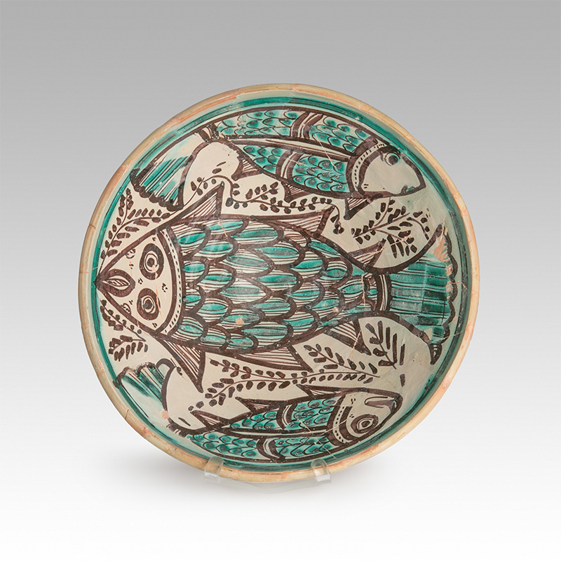 Peix fresc. Des d’orient a l’art bizantí passant per Itàlia, o bé pel sud des de l’Iran i el Califat de Còrdova, la tradició ceràmica de la Mediterrània arriba a Paterna. El peix és símbol de fertilitat a l’islam i de Jesús per als cristians, però també es representa sovint per ser un ingredient típic de la cuina dels pobles de la vora del mar. Sigui com sigui, l’artesà que el va pintar no es va limitar a fer la forma d’un peix qualsevol, sinó que va preferir representar-hi al centre un llenguado, identificat clarament per tenir els dos ulls al mateix costat, talment com un peix picassià avant la lettre!