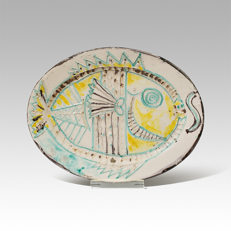 Picasso tot s’ho menja «Però és possible que hagin fet això abans que jo?» va dir Picasso, meravellat, en una exposició de ceràmica espanyola dels segles XIII al XIX celebrada a Cannes el 1957. Posteriorment, l’artista va fer una donació als museus de Barcelona de setze peces seves, amb la condició que fossin exposades al costat de les obres antigues, posant així de manifest que la idea del peix al plat que hem vist tantes vegades en les seves peces ceràmiques era ben antiga. Queda palès que la voracitat artística de Picasso ha sobrepassat tècniques, estils i segles, tot i que el seu treball amb la ceràmica es va centrar sobretot a gravar i esmaltar per decorar tipologies tradicionals. Fruit de la col·laboració amb el taller de Madoura Pottery a Vallauris entre 1947 i 1971, Picasso crea al voltant de sis-centes sèries ceràmiques, centrant-se més en la producció per sobre de la investigació tècnica i plàstica del mitjà, a diferència del que va fer Joan Miró amb el ceramista Josep Llorens i Artigues.