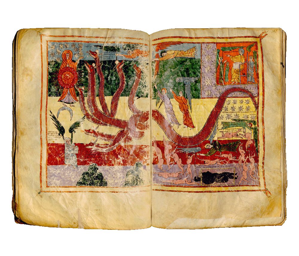 Anònim. Beat de la Seu d’Urgell, La dona i el Drac. Apocalipsi XI, Ms 26 f° 140v 141, segle X. Pergamí cal·ligrafiat i il·lustrat. Provinent de la Catedral de la Seu d’Urgell.