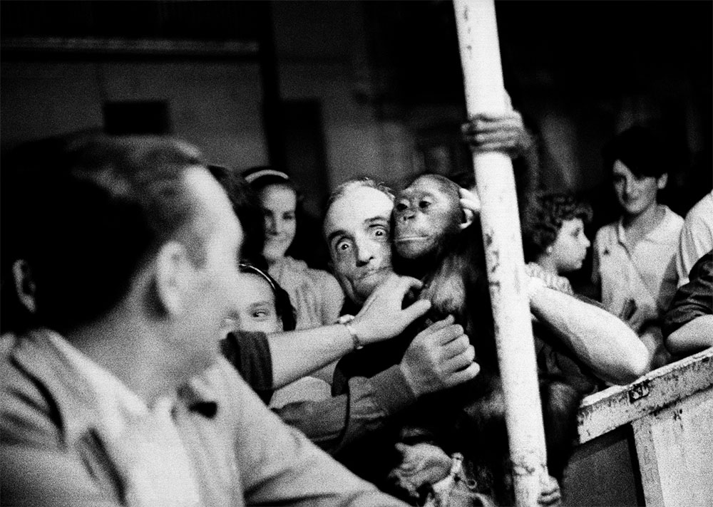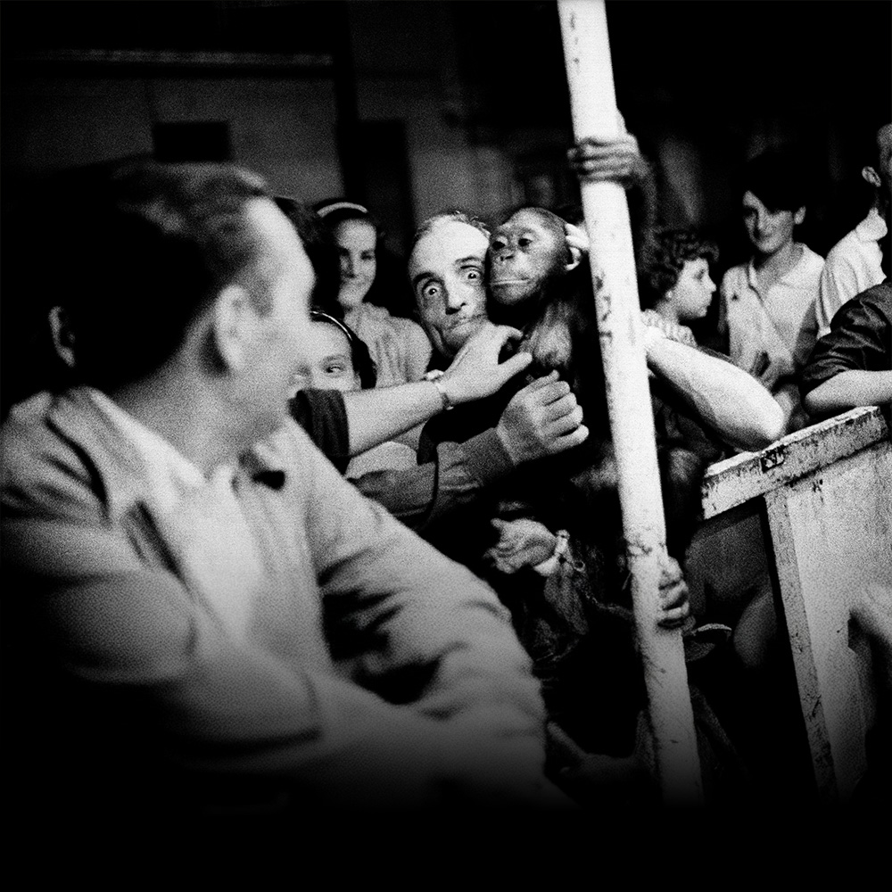Els anys seixanta del segle passat van ser un bon moment per a l’edició de fotollibres, dels quals Barcelona. Blanc i negre (Aymà, 1964) n’és un exemple excepcional, un llibre de gran format de 371 fotografies de Xavier Miserachs amb textos de Josep Maria Espinàs. La mirada del fotògraf, a peu de carrer, espontània i directa, va suposar una renovació del llenguatge fotogràfic documental espanyol, juntament amb altres companys de professió com Oriol Maspons, Colita, Ricard Terré o Ramon Masats, amb William Klein com a referent. La sèrie Barcelona. Blanc i negre és un assaig fotogràfic que trenca amb la manera tradicional d’explicar la ciutat i la seva gent. Miserachs deixa constància d’una Barcelona que està desapareixent, la més popular, com la que permetia l’exhibició i explotació d’animals en espectacles i fires. Aquesta imatge capta l’instant en què “la mona” expressa més humanitat que l’home, que necessita ridiculitzar la bèstia per reafirmar la seva condició humana.