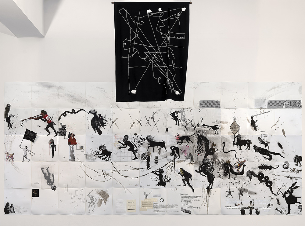 Obra coral, un collage de tècniques que aplega música, dibuix, fotocòpia, text, a més d’un estendard de roba brodat en blanc. Una mena de processó de personatges de procedència diversa, sovint híbrids de cultures i èpoques dispars, acompanyada de cites que van des de Shakespeare a Leonard Cohen, passant per Kafka. Referències cultes que ja formen part de la tradició popular, com els bestiaris medievals o la dansa de la mort de Holbein, barrejades amb figures que semblen ombres xineses o personatges sortits d’una pel·lícula de Miyazaki, amb un regust del Bosch i, perquè no, amb un record de la desmesura i sentit de l’humor de Hogarth o Goya. Alguns reguerots i tatxades de pintura ens acaben portant cap a Tàpies, i tot plegat ens fa pensar en els murs enigmàtics del París de Brassaï. Tanta riquesa de referents permet aquesta varietat d’aproximacions, diríem, un veritable i atemporal bestiari contemporani.