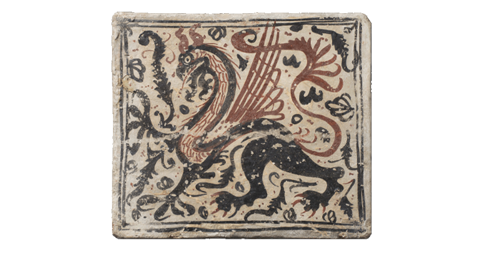 Els socarrats eren plaques de ceràmica rectangulars col·locats entre les bigues de fusta que decoraven els sostres de palaus i edificis significatius religiosos i civils. Sobre una base blanca s’apliquen dos colors, el vermell (òxid de manganès) i el negre (òxid de ferro), i la superfície es deixa sense vidriar. Fou la vila de Paterna el principal focus de producció de socarrats entre els segles XIV i XVI. Els motius decoratius solien ser geomètrics, epigràfics, heràldics, antropomorfs i zoomorfs, amb animals reals o fantàstics, com és el present cas: un griu isolat. Aquesta bèstia híbrida, meitat àliga meitat lleó, a voltes simbolitza un animal protector o també pot ser una representació del mal. El seu origen el trobem en les antigues civilitzacions del Pròxim Orient per convertir-se en una iconografia freqüent durant l’antiguitat clàssica i que posteriorment arribarà als bestiaris per difondre’s arreu de les manifestacions plàstiques medievals.