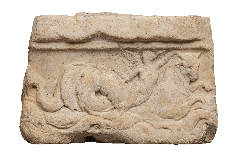 Fragment de coberta de sarcòfag amb un brau marí, Imperi romà, segona meitat del s. II dC. Marbre de Luni esculpit. Museu Episcopal de Vic.