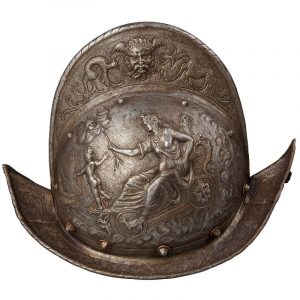 El morrió és el casc emblemàtic dels Tercios castellans, principalment arcabussers i piquers, que s’imposa a la Península a la darreria del segle XVI i tot el XVII. En funció de la graduació, com s’ha perpetuat en la tradició militar des del món grecoromà, el casc anava rematat o vestit amb màscares i coronaments zoomòrfics, ara reinterpretats amb una iconografia i un repertori ornamental que els orfebres copiaven de gravats. Aquest morrió presenta a la cresta un cap barbat i alat en relleu, flanquejat per dos monstres amb extremitats vegetals, elements propis del món del grotesc que es repeteixen en les rodes i el mascaró del carro de Venus, curiosament una deessa que preferia no fer la guerra.