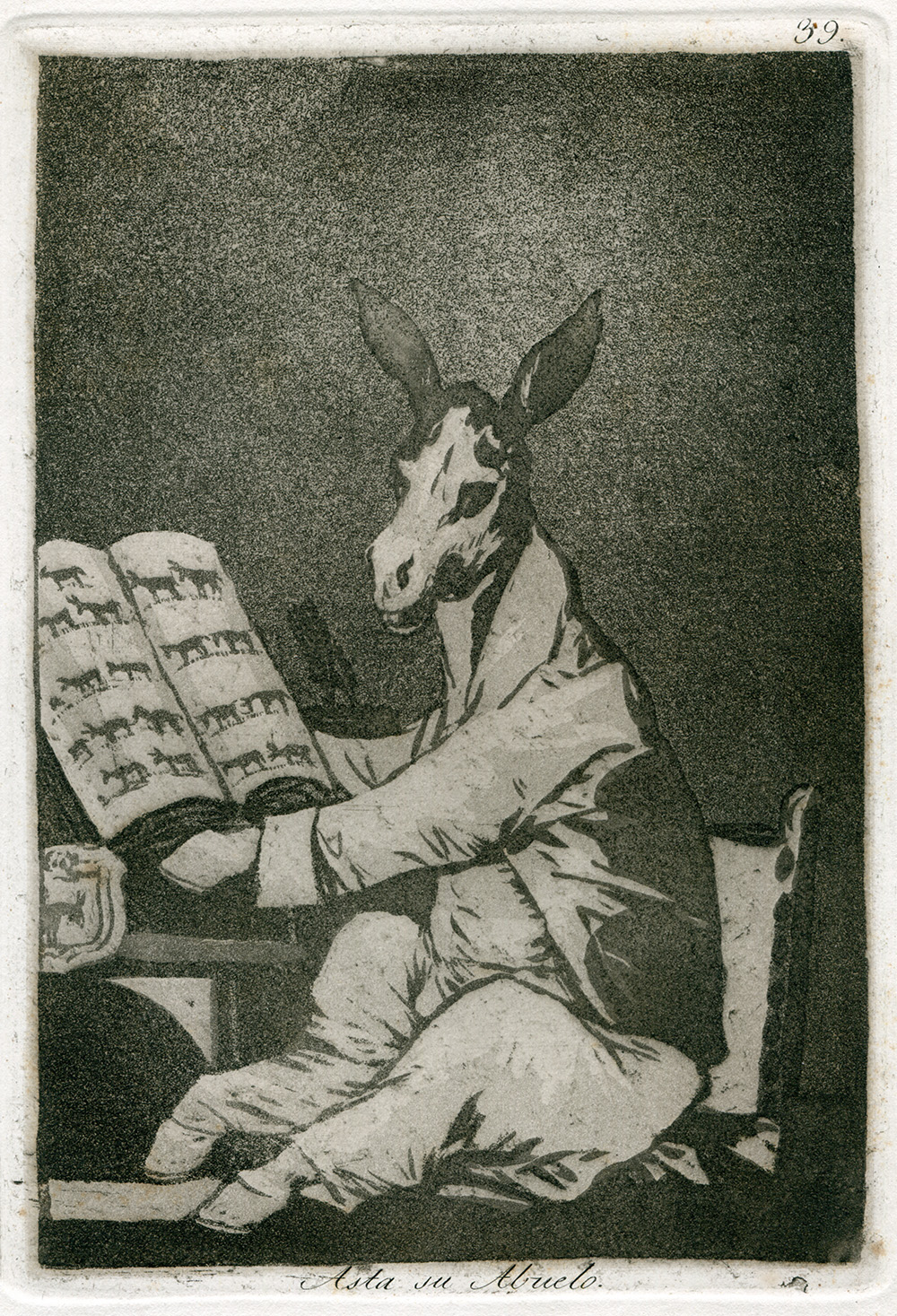Catorze dies trigà Goya a retirar de la venda la sèrie dels Caprichos per por a les represàlies, tot i ser el primer pintor de cambra del rei. Es van posar a la venda el dia 6 de febrer de 1799 en una botiga de perfums i licors, al número 1 del carrer del Desengaño de Madrid. Goya pretenia censurar «los defectos y errores humanos», obrint la porta a la crítica il·lustrada i a la modernitat plàstica i temàtica que el situa com a clar precursor dels moviments artístics dels segles XIX i XX. Entre les vuitanta estampes dels Caprichos cal subratllar les Asnerías, és a dir, ases en actituds humanes, amb el que això significa per a la tradicional associació de l’ase amb un animal poc intel·ligent. Aquesta estampa, tot i que hi ha diferents interpretacions, es relaciona amb Manuel Godoy, car es va fer preparar una genealogia que el feia descendent dels reis gots per tal de justificar la seva ràpida ascensió dins la Cort espanyola.