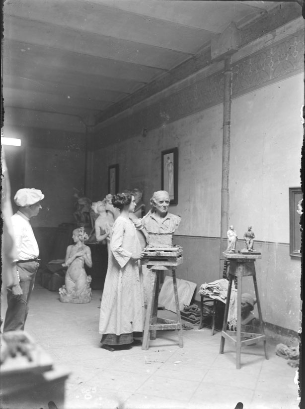 No és fins a finals del segle XIX que les catalanes poden accedir a la formació artística reglada, és a dir, a l’aprenentatge de les arts en centres públics i oficials. A Barcelona, a principis de 1883 es posa en funcionament l’Escola de Dibuix i Pintura per a Nenes i Adultes, i el 1885 trobem les primeres inscrites als ensenyaments d’art a la seu central de la Llotja, malgrat que caldrà esperar als primers anys del segle XX per descobrir dones matriculades a classes d’escultura. El principal argument que s’esgrimia per tal de justificar la seva exclusió del sistema educatiu acadèmic era la presència de models nus a les aules, destinats a l’aprenentatge de l’anatomia humana.