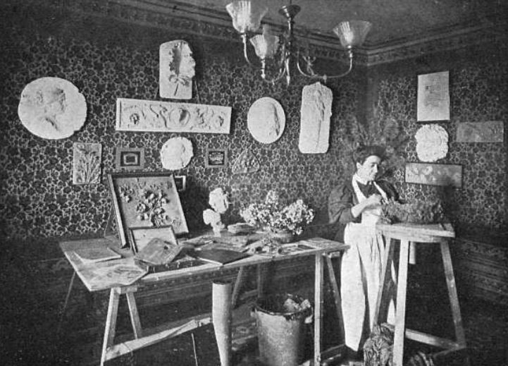 Pilar Portella i Estrada (1874-1941) al seu taller. Fotografia de Thomas publicada a Feminal, núm. 17, 1908. Wikimedia Commons.