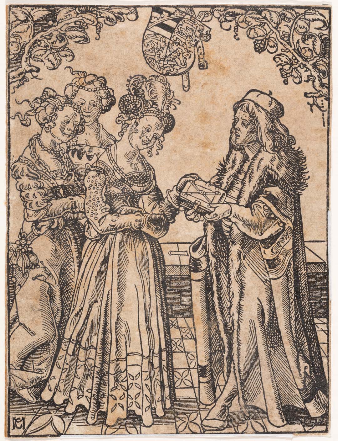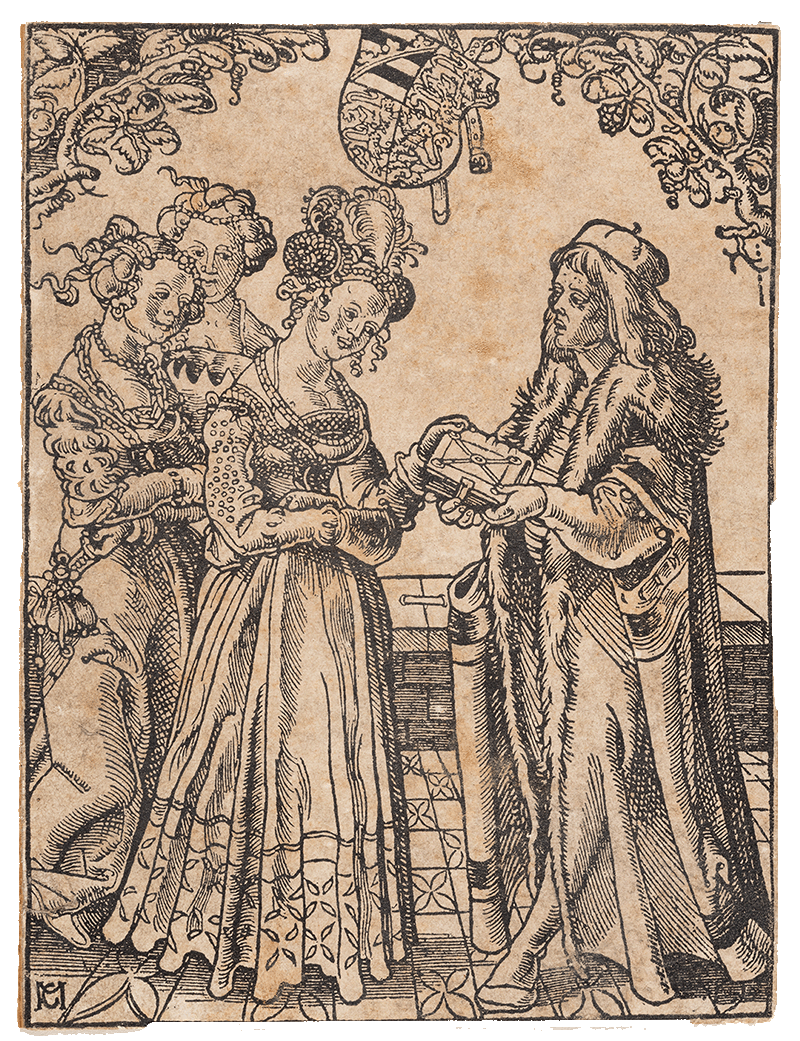 La irrupció de la impremta a finals del segle XV va transformar la manera de difondre el saber. En temps de l’humanisme i el renaixement, els llibres, acompanyats sovint d’il·lustracions, es van estendre a gran escala i van permetre una propagació més ràpida i eficaç del coneixement. En aquest context, acompanyant l’aparició dels textos de caràcters mòbils, l’art de la xilografia va esdevenir un nou mitjà complementari per a la transmissió d’idees i de tota mena de pràctiques, també mèdiques i sanitàries. És el cas d’aquest gravat de Martin Kaldenbach, deixeble de Dürer, procedent d’un important llibre d’obstetrícia d’Eucharius Rösslin publicat a Estrasburg el 1513. Si bé la imatge mostra l’autor del llibre donant-ne un exemplar a Katharina von Braunschweig-Lüneburg, a qui va dedicar l’obra, aquesta última incloïa a l’interior un conjunt de vint xilografies que mostraven per primera vegada les posicions del fetus, l’úter i el part.