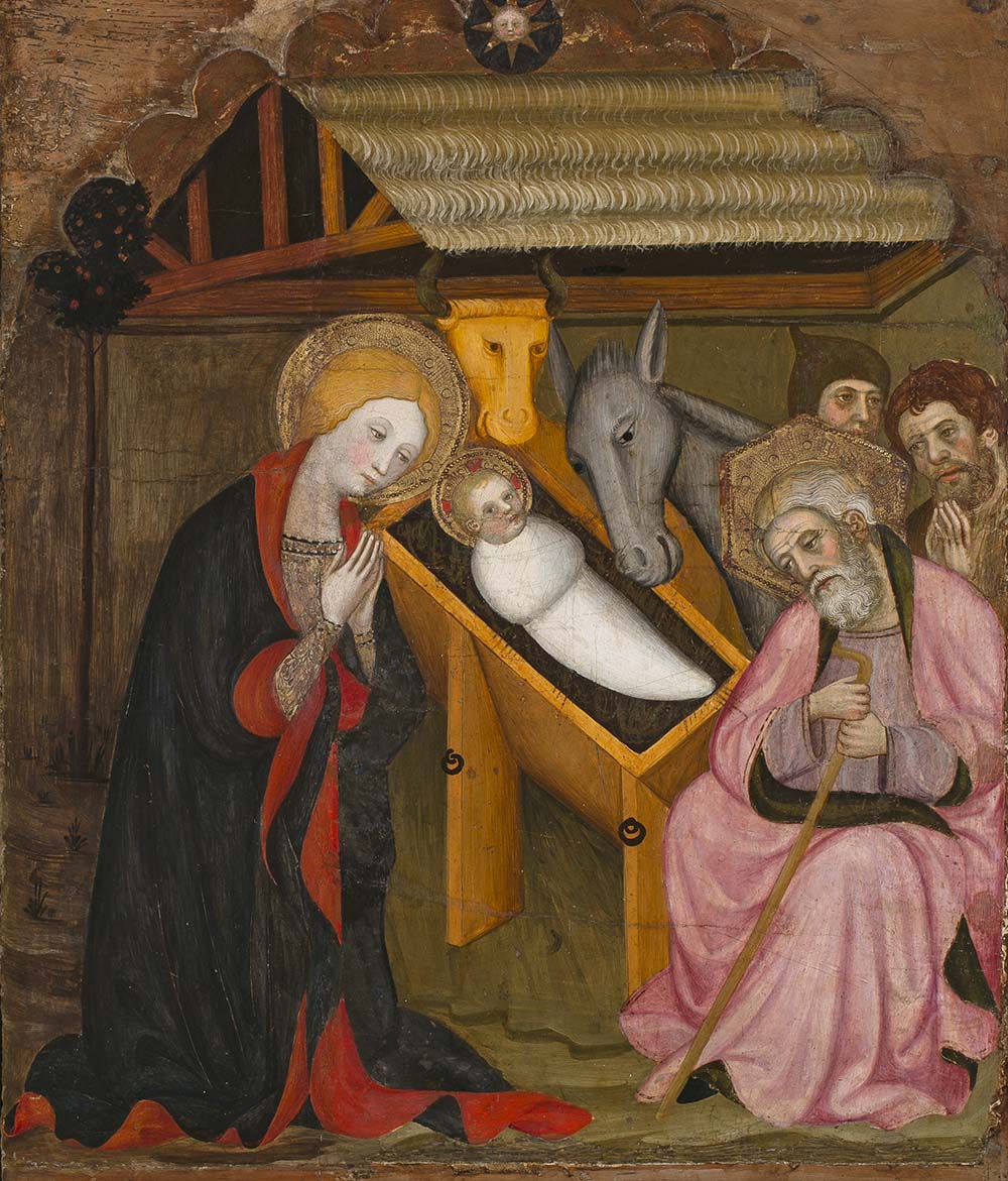 Al marge de la fredor d’un nounat nu i solitari a terra, adorat per Josep i Maria segons les visions que Santa Brígida havia tingut en somnis, a partir del segle XIV, i fruit d’un procés progressiu d’humanització, la imatge de la Sagrada Família sovint va començar a ser més propera, càlida, viva i tendra que en representacions anteriors. Un exemple prou representatiu el tenim amb aquesta escena pintada per Pere Serra al voltant del 1400, amb sant Josep, la Verge, el bou i la mula acompanyant el nen embolcallat amb bolquers dins la menjadora.