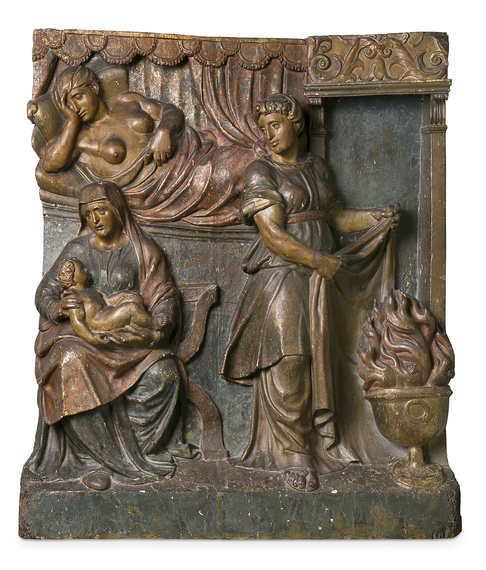 L’any 1633 Bernini va esculpir, als escuts del baldaquí de l’altar major de Sant Pere del Vaticà, diversos rostres representant cadascuna de les diverses fases d’un part. Amb tot, no és freqüent trobar imatges que, en el passat, hagin reproduït el part d’una manera realista. En canvi, gràcies a les narracions extracanòniques dels evangelis apòcrifs de la nativitat (Protoevangeli de Jaume, Pseudo-Mateu, De nativitate Mariae…), en la tradició cristiana abunden obres que celebren els primers moments del naixement. Aquest és el cas del part de la Mare de Déu, sovint representat amb més verisme que les habituals imatges miraculoses del nen Jesús. En aquest relleu, Santa Anna es mostra ajaguda al llit, descansant després de parir, amb una dida donant el pit i una altra dona eixugant els bolquers.