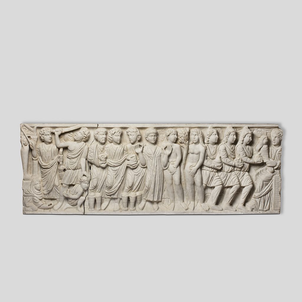 Si bé en l’art grecoromà podem trobar nombroses imatges amb la presència de nens, el fet que aquests no formessin part de la vida pública els va relegar normalment a un paper secundari o vinculat a escenes simbòliques, creences o mites, com el d’Eros. Tanmateix, tan aviat com van despuntar les primeres imatges paleocristianes, van aparèixer les primeres imatges de l’infant Jesús. Un bon exemple el tenim amb aquest frontal de sarcòfag tardoromà, creat per un taller d’escultura de Roma cap als inicis del segle IV dC. Representa, d’esquerra a dreta, la resurrecció de Llàtzer, el sacrifici d’Isaac en mans del seu pare Abraham, la multiplicació dels pans i els peixos, l’orant, el pecat original d’Adam i Eva i, finalment, l’adoració dels reis mags al nen Jesús, embolcallat amb bolquers i en braços de la Verge.
