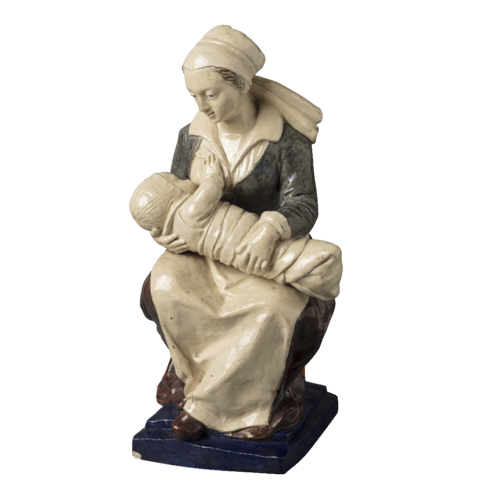 El vincle de les mares amb els seus nadons es va estrènyer en època moderna, especialment a partir de finals del segle XVIII i en el context del sorgiment de la família burgesa; l’afecte maternofilial va fer que moltes mares decidissin començar a alletar els seus propis fills en lloc de deixar aquesta responsabilitat en mans de les dides. Les dides eren dones que es dedicaven professionalment a la lactància de nadons, fos per falta de llet natural per part de la mare biològica o per motius socials, i sovint s’ocupaven també de cuidar els nens dels orfenats. La figura d’aquesta dida de pisa policromada va ser copiada al segle XIX d’un original d’inicis del segle XVII de l’escultor francès Guillaume Dupré, conservat al Museu Nacional de Ceràmica de Sèvres, i va ser adquirida pel Museu de Reproduccions Artístiques de Barcelona.