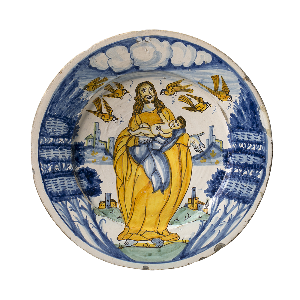 La Xarxa de Museus d’Art de Catalunya compta amb un gran nombre de maternitats de totes les èpoques, siguin talles o retaules d’època gòtica com escultures modernes d’autors com Llimona o Gargallo que retraten mares alletant els seus fills. En canvi, el que no és freqüent és trobar paternitats, un fet que tampoc ha de sorprendre si tenim en compte que el rol que la societat atorgava als pares mai era el de cuidar els infants: “aquesta primera educació pertoca incontestablement a les dones: si l’Autor de la natura hagués volgut que fos cosa dels homes, els hauria donat llet per a nodrir els infants”, argumentava Rousseau. Amb tot, es poden trobar escenes com la d’aquest plat de manufactura catalana barroca, de la sèrie de faixes i cintes, on Josep, que segons diversos evangelis apòcrifs havia estat pare de quatre fills i dues filles fruit d’un primer matrimoni anterior al de Maria, apareix amb un nen en braços. Sant Josep sempre va adoptar un paper secundari en la iconografia del nen Jesús, per bé que la seva paternitat legal, que no natural, va permetre que, a vegades, aparegués tenint cura del nadó.