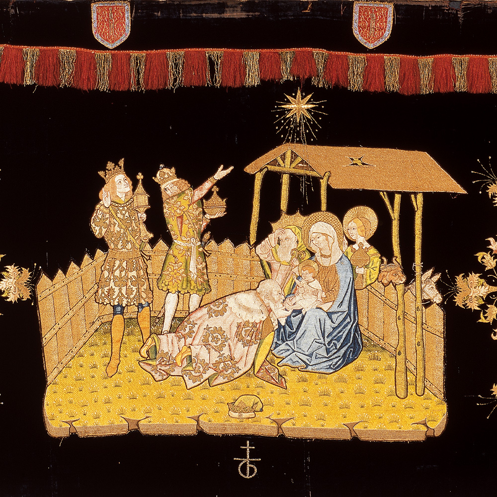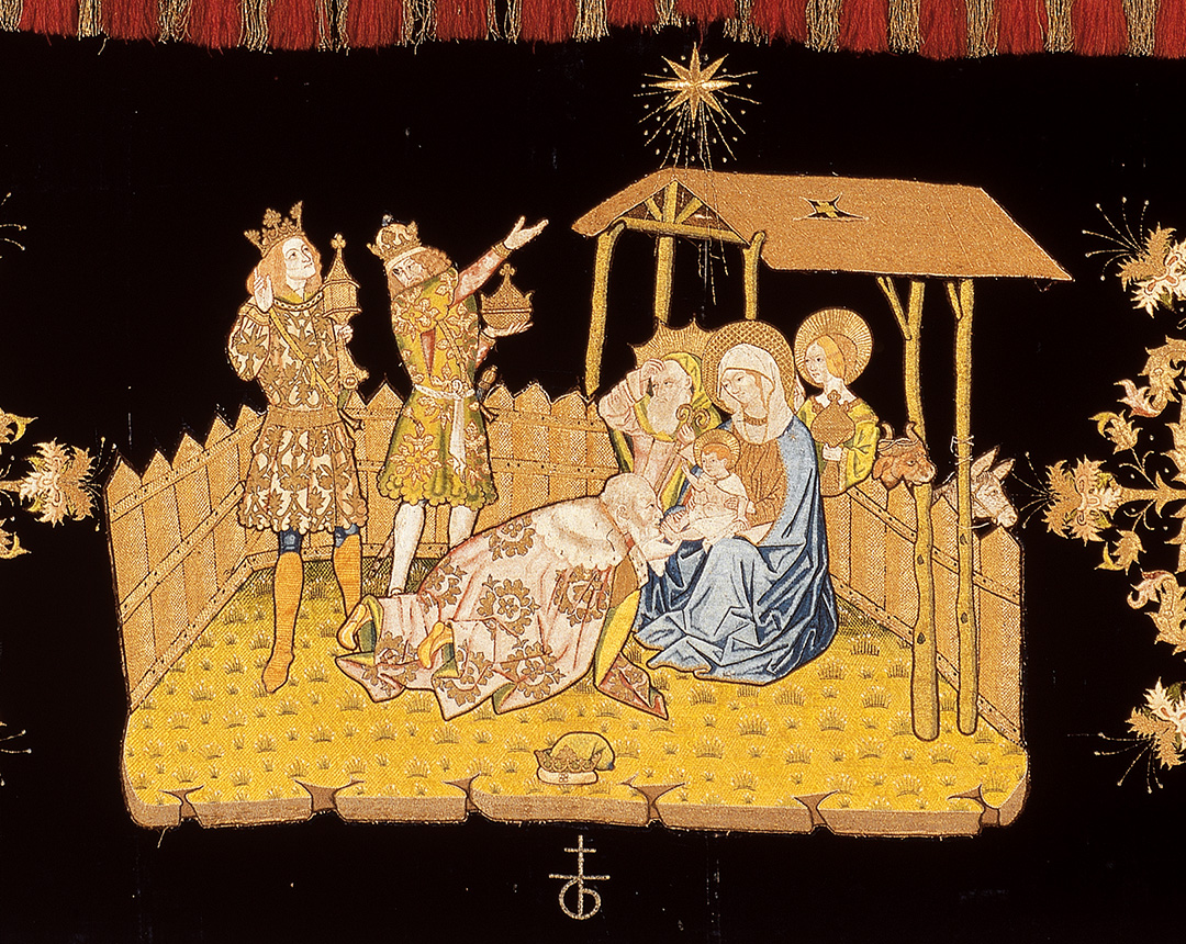 La descripció de l’Epifania a l’evangeli de Sant Mateu, així com en altres textos posteriors, va fer que aquesta ràpidament s’estengués com una de les escenes més representades de la infantesa de Crist, esdevenint l’origen d’una de les tradicions nadalenques més esperades pels petits. El Museu Episcopal de Vic, que disposa d’una de les col·leccions de teixits i indumentària litúrgica més importants de Catalunya, en guarda un testimoni especialment valuós: el Frontal de l’Epifania. Provinent del monestir de Sant Joan de les Abadesses, va ser encarregat a mitjan segle XV pel prevere Joan de Robira i per Jaume Tenes. Destaca per l’exquisida escena dels tres reis brodada sobre el vellut amb un gran sentit pictòric: a l’estable s’hi troba la Mare de Déu amb el nen Jesús assegut a la falda, acompanyats de sant Josep, Salomé, la llevadora de què parlen els evangelis apòcrifs, i el bou i la mula. Davant de la Sagrada Família s’hi troben els reis d’Orient vestits com nobles del segle XV: Melcior besa els peus de l’infant, mentre Baltasar i Gaspar, amb les ofrenes en mà, observen encara l’estrella que els ha guiat fins a l’establia.