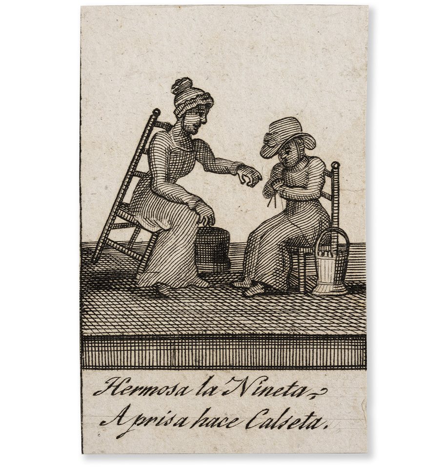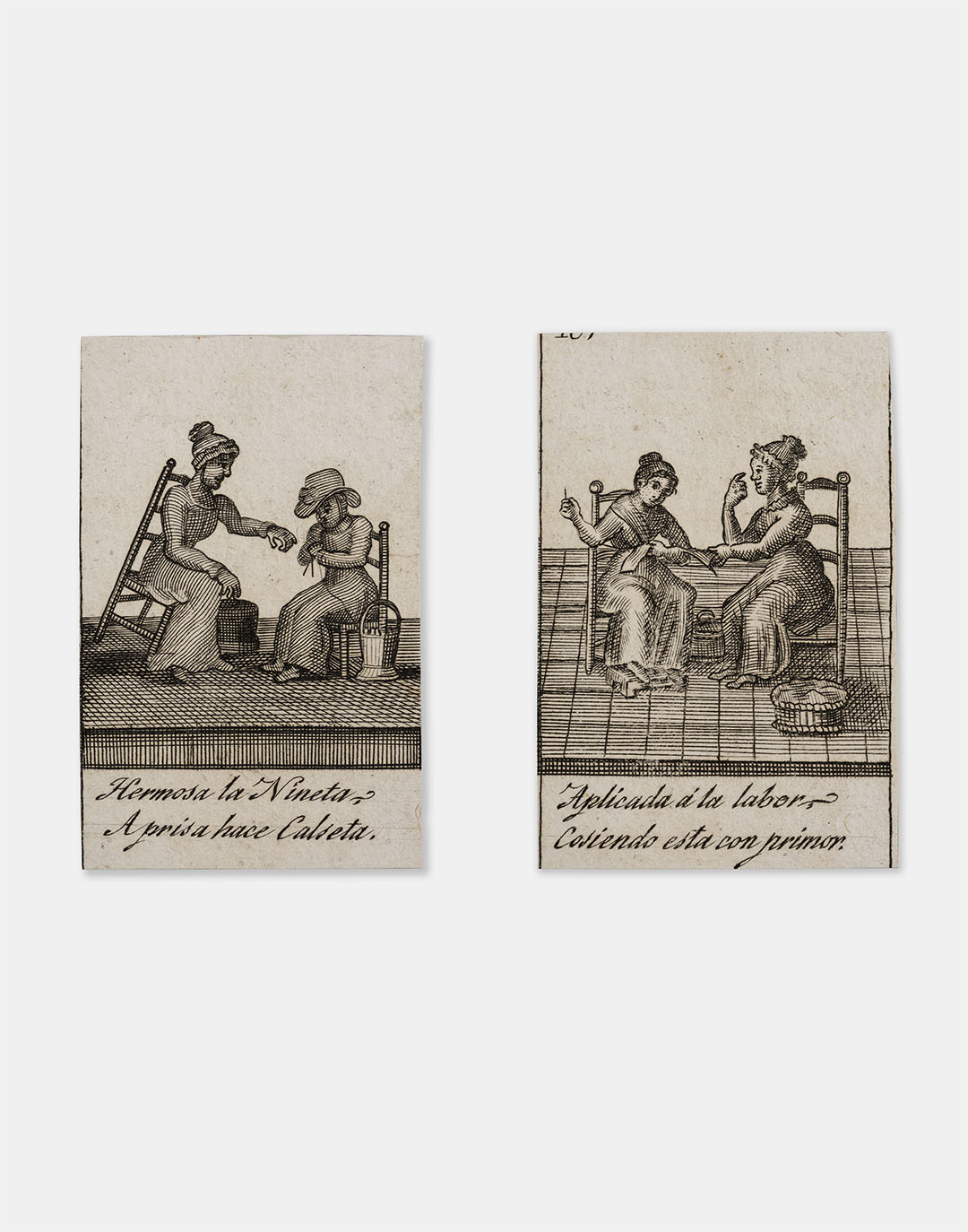 Els grans retrats a l’oli no són els únics testimonis de l’extensió dels rols de gènere a la infància. Ans al contrari, són tan sols la representació més elitista i la punta de llança d’un imaginari estès a tots els estrats socials i que, per tant, es va reproduir en tot d’imatges que afirmaven i corroboraven els comportaments socials d’obediència, laboriositat i docilitat femenina. Aquesta segmentació ja des de la infància la trobem tant a la literatura com també a la imatgeria popular, en gravats i boixos de reproducció econòmica i massiva, que al llarg dels segles XVIII i XIX van córrer per les cases. És el cas d’aquests dos fragments d’una auca del segle XIX amb els versos que acompanyen les imatges de dues nenes que aprenen a cosir:</p> <p>Hermosa la nineta, a prisa hace calseta.<br /> Aplicada a la labor, cosiendo esta con primor.