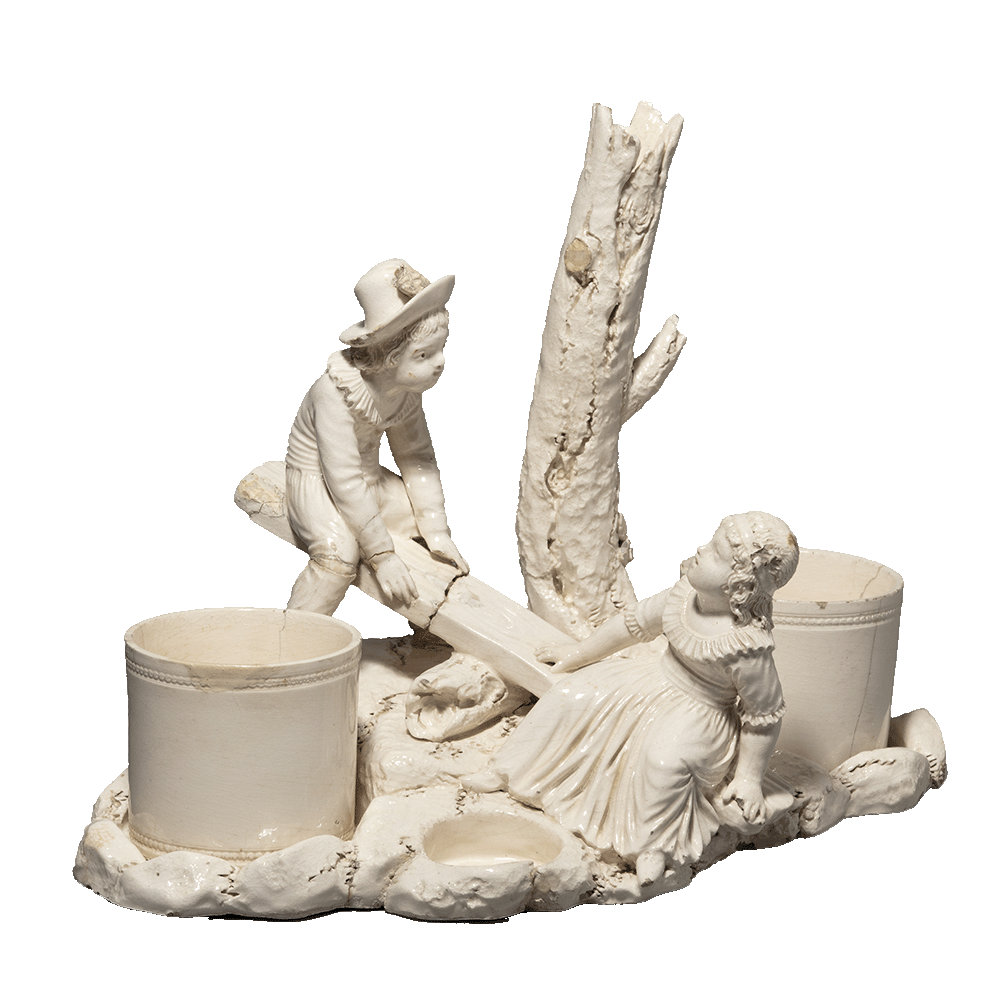 Aquesta escena de joc, on un nen i una nena juguen dalt d’un balancí improvisat a partir de la soca d’un arbre i d’una llata de fusta, ens parla de la nova estètica galant i bucòlica, alhora de gust popular i d’estil sobri, difosa en temps del neoclassicisme. El color cremós de la pasta ceràmica, fet amb pisa, evoca l’èxit de les manufactures angleses de creamware o terra de pipa, que a finals del segle XVIII van ser importades pel compte d’Aranda a les manufactures valencianes d’Alcora. Com que la seva producció era excessivament cara, sovint es va optar per fabricar aquesta mena d’objectes decoratius amb pisa recoberta amb un esmalt blanc-cremós per imitar el luxe de les creamware originals.