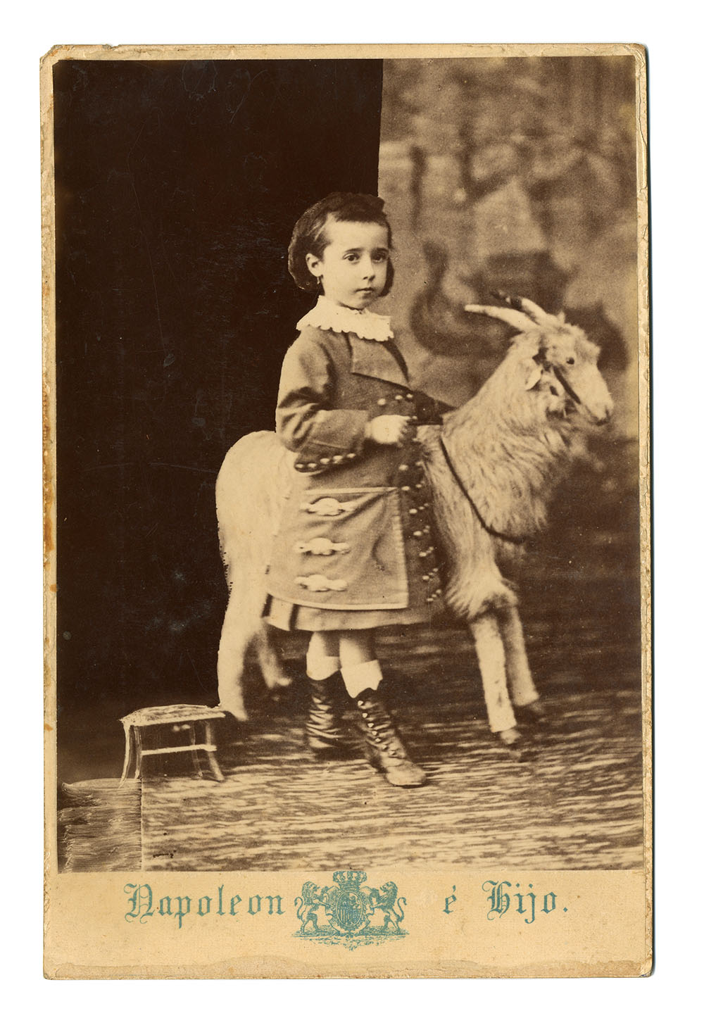 A mesura que es van anar difonent els avenços de la fotografia i sobretot després que A.A.E. Disderi patentés l’any 1854 la carte de visite, aquesta es va democratitzar i va convertir-se en una pràctica social estesa i econòmica per recordar els membres de la família en les seves diverses etapes vitals, també la infantesa. En aquest cas, la nena va ser retratada amb una de les luxoses joguines que devia haver-hi a l’estudi dels reputats fotògrafs Napoleon e hijo de Barcelona, posant dreta al costat d’una cabra en la qual es recolza per mantenir-se ben quieta i, així, no sortir borrosa a la imatge.