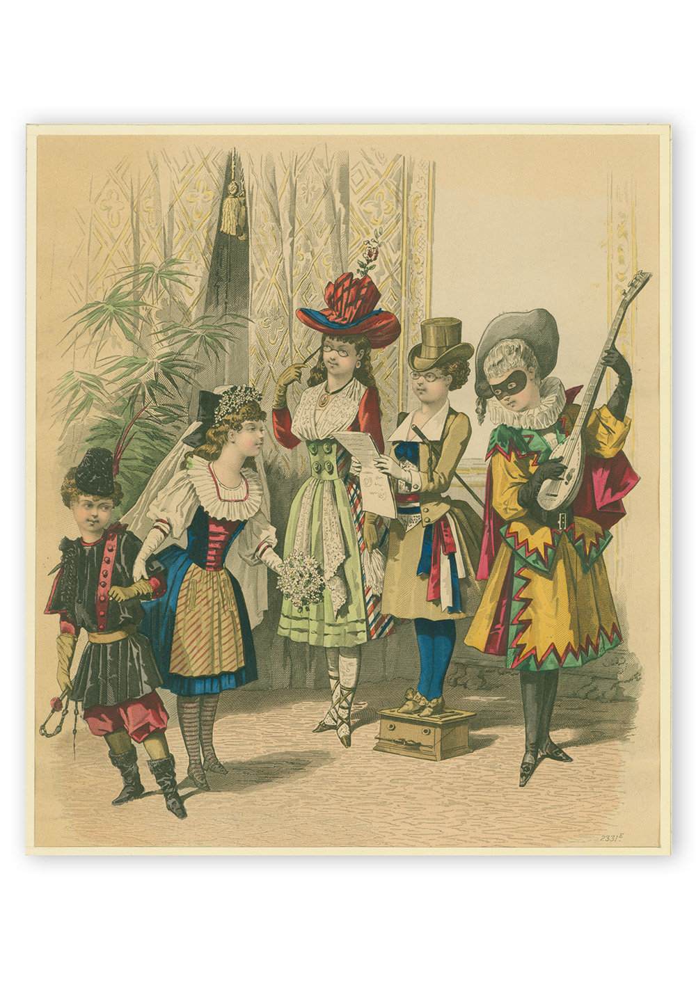 L’avenç de la tecnologia de la impressió i la difusió de la litografia van fer del segle XIX un segle marcat per l’augment de les imatges, que es van difondre en gran quantitat i a baix cost entre tota la població. Cases d’impressió franceses com les de Selle & Châlon o Mome et Falconer van difondre al llarg de la segona meitat del segle XIX un gran nombre de làmines il·lustrades a color que retrataven les modes i costums parisenques, moltes d’elles incloses en publicacions periòdiques (Les modes parisiennes, Le moniteur de la mode, Journal des demoiselles, etc.), i altres a la venda de manera independent. Eren escenes que majoritàriament estaven dedicades a la canviant moda femenina, però que, cada cop més, van anar incorporant escenes d’infància, com és el cas d’aquesta estampa de carnestoltes. Al llarg de la segona meitat del segle XIX, als balls de màscares i de disfresses de Carnaval, progressivament s’hi van anar afegint certàmens, balls i festes de disfresses dedicades a la infància i organitzats en alguns dels principals teatres de la ciutat.