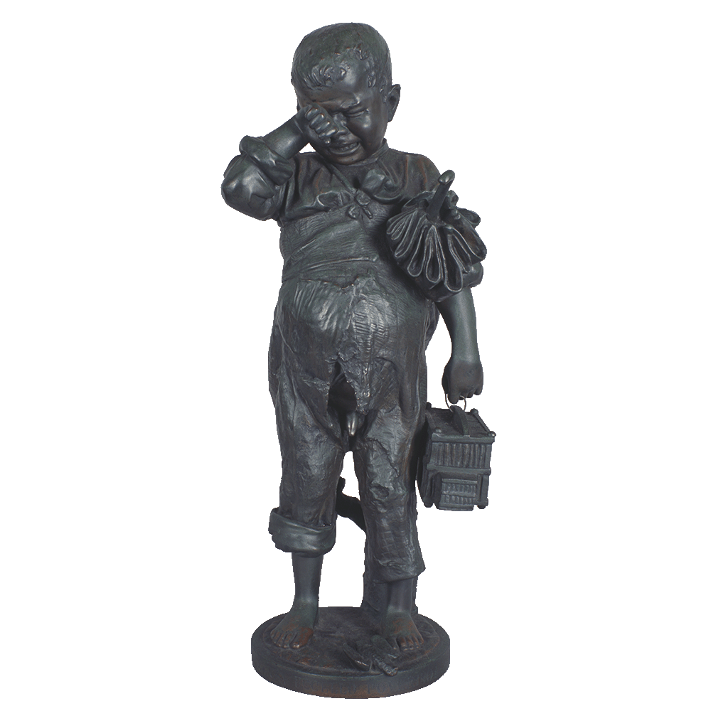 No sempre la infància apareix jugant o en actitud alegre, també és freqüent trobar representada la fràgil frontera entre el riure i el plor, i la rapidesa i el contrast amb què aquestes actituds i emocions poden aparèixer en la vida dels nens. Somriures i llàgrimes expressen una mateixa sensibilitat a flor de pell. En aquest cas, però, el desconsol del nen no es deu a cap rebequeria, sinó a la pèrdua del seu ocell, el cadàver del qual resta inert als seus peus. Es tracta d’un retrat realista i tendre, seguint la tendència de l’escultura de gènere i el gust per imatges de temàtica anecdòtica, que va ser inicialment presentat en terracota, a l’Exposició de Belles Arts de la Sala Parés el febrer de 1884 i que posteriorment va ser fos en bronze. A més d’aquest exemplar en mans de Santiago Rusiñol i conservat al Cau Ferrat, una segona còpia de l’escultura va ser mostrada la primavera de 1891 a la Primera Exposició General de Belles Arts de Barcelona, on va ser adquirida per la Diputació de Barcelona.