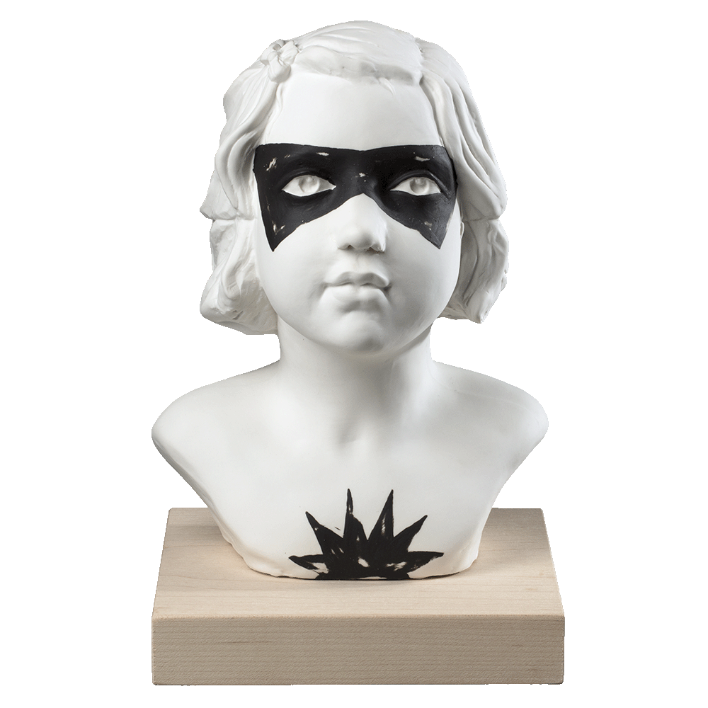 Amb la sèrie Super Héroes, Núria Torres, que habitualment treballa l’escultura tant des del marbre com des de la porcellana, va acostar-se a la infància des d’una mirada adulta, però plena d’admiració. Els diversos busts infantils de nens i nenes de la sèrie van ser concebuts jugant amb efectes del blanc i l’ús de la policromia aplicada a la porcellana, en aquest cas només amb antifaços i escuts de color negre. Així, a partir de l’aparent oxímoron d’una heroïna de porcellana (hi ha res més fràgil que la porcellana i res més resistent i noble que un superheroi?), l’artista aconsegueix retratar l’inabastable imaginari infantil i els seus mons de somnis i fantasia.