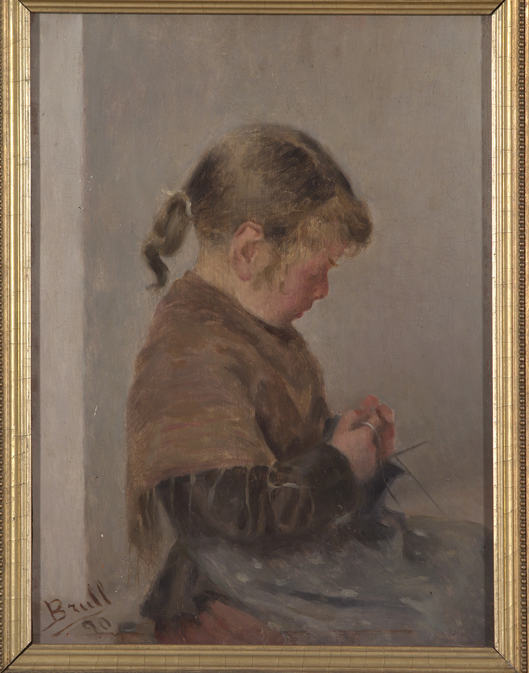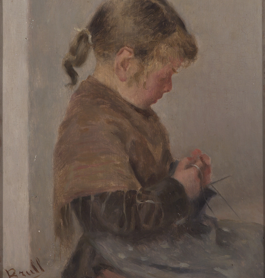 Olis com la Nena cosint (c. 1720) d’Antonio Amorosi, conservat al Museu Nacional, posen de manifest com durant el segle XVIII van proliferar arreu d’Europa pintures protagonitzades per nens; escenes que tant podien tenir un fonament mitològic o religiós com ser retrats al·legòrics o bé imatges fidels del món modern. Aquest és el cas de la Noia que fa mitja, de Brull, de la qual es conserven dues còpies a la Xarxa de Museus d’Art de Catalunya. A diferència dels retrats de nens, on aquests sovint apareixien dibuixant, llegint, jugant o en altres actituds de lleure, la pintura Noia que fa mitja mostra el rol de les nenes, dedicades a formar-se per servir i atendre les tasques de la llar. Modestament vestida, ni somriu, ni mira a l’espectador: es mostra concentrada en la seva feina, aplicada i obedient, fent mitja.