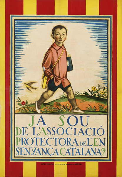 Aquest cartell, d’actualitat permanent, recull l’ideal noucentista de la Mancomunitat de Catalunya en defensa de la llengua i la cultura catalana a través d’un dels seus pilars essencials, l’escola. Va ser fet per encàrrec de l’Associació Protectora de l’Ensenyança Catalana (APEC) amb l’objectiu de potenciar l’ensenyament de la llengua a nens i nenes d’una societat i un país que, malgrat els intents d’aniquilació cultural, encara tenia el català com a llengua vehicular entre la població. El dibuix de Josep Obiols, de tons vius, però d’esperit calmat, mostra el desig de tants artistes del noucentisme que, com Josep Aragay, van buscar la identitat en la representació ideal d’una terra eminentment mediterrània, cívica, popular i culta, on des de la infància es pogués viure i créixer en català.