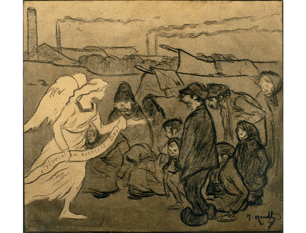 En una època de gran conflictivitat social i marcada per la tensió que provocaven les diferències de classe, Nonell va optar per unes temàtiques eminentment socials, retratant i denunciant la misèria, la injustícia i la vida dels pobres de la ciutat industrial. Personatges humils, desemparats, orfes, indigents i altres necessitats, també els nens, van esdevenir protagonistes i signe d’identitat de moltes de les seves obres. Aquest dibuix, reproduït al suplement d’any nou de 1897 de La Vanguardia, mostra la sensibilitat de Nonell pels marginats a través dels nens que vivien o malvivien als suburbis de les fàbriques de Barcelona. Els rostres, que recorden el cretinisme que havia descobert a la Vall de Boí l’estiu anterior, i el miserabilisme que desprèn tota l’escena, contrasta críticament i de manera volguda amb la presència irreal d’un àngel anunciant la bona nova del naixement del fill de Déu.