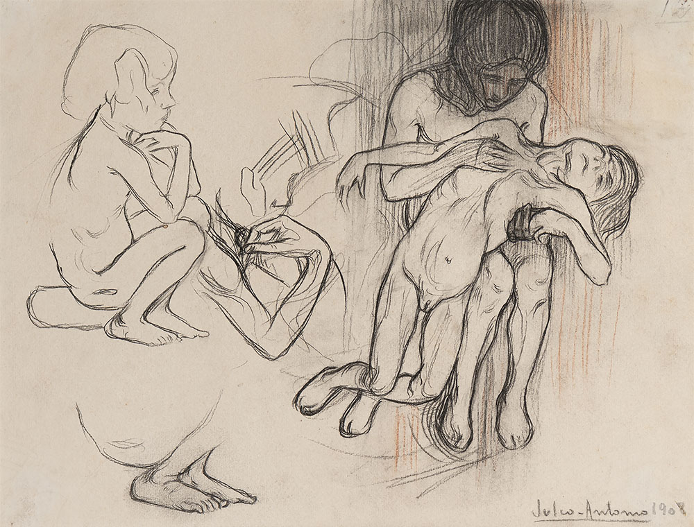 Nascut a Móra d’Ebre el 1889 i mort prematurament el 1919, Julio Antonio va ser un dels escultors catalans de més vàlua del seu temps. Aquest dibuix és possible que sigui una de les diverses notes al carbó i sanguina fetes entre Toledo i Madrid exposades el 1908 a Tarragona. Julio Antonio es va interessar per les classes desafavorides, els gitanos, els pobres i la misèria buscant a vegades un expressionisme que recorda el d’Els degenerats, de Carles Mani. En aquest cas, el dibuix protagonitzat per una nena nua que sembla haver defallit, podria remetre a notes per algun grup escultòric anterior al projecte de Monument als herois de Tarragona, en el qual va començar a treballar entre 1909 i 1910, i on apareixia una dona sostenint un heroi mort i un de ferit.