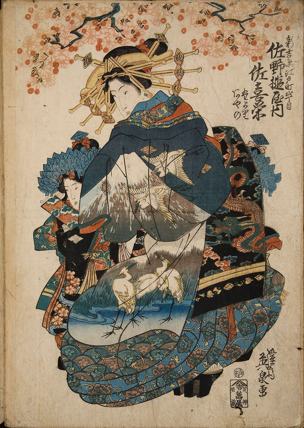 Com a moltes altres grans urbs, les grans ciutats del Japó dels segles XVIII i XIX van comptar amb barris llicenciosos on s’oferien serveis de prostitució, com era el cas de les cortesanes del barri de Yoshiwara d’Edo, l’actual Tòquio. Aquestes tenien l’ajuda de les kamuro, nenes d’entre 7 i 9 anys que assistien a les cortesanes d’alt rang alhora que les educaven per, en el futur, ocupar el seu lloc als bordells. En bona part dels casos van ser venudes a les cases de prostitució per part de famílies pobres que no disposaven d’altres recursos i amb l’esperança que en el futur poguessin ser alliberades, comprades o fins i tot casades. Aquesta estampa mostra la cortesana Sakie, de la casa Sanotsuchiya, de Shin-Yoshiwara (Edo), luxosament vestida i acompanyada de les seves dues ajudants kamuro, anomenades Tayori i Ayano, vestides amb un quimono a joc, en ocasió de la popular desfilada que un cop a l’any se celebrava sota les flors dels cirerers del barri.