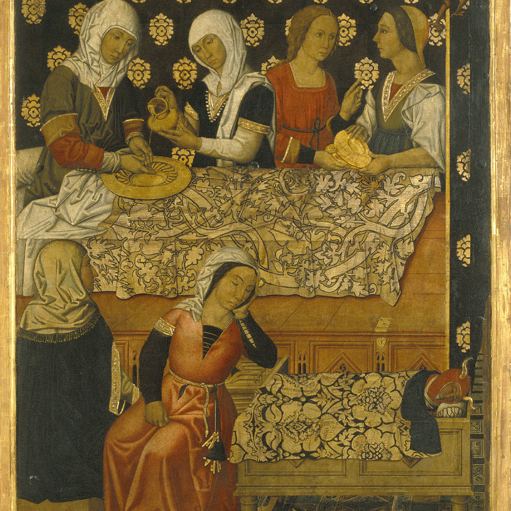 Durant el postpart, tant en el moment del part com durant les primeres setmanes de cures, el nounat vivia en un univers femení on la mare sovint estava acompanyada de llevadores que s’ocupaven de les primeres atencions. Les escenes de temàtica bíblica, especialment cristiana (el naixement de la Verge, sant Joan o Jesús), són les que d’una manera més prolífica han descrit i representat aquests moments i ens permeten descobrir tant les pràctiques com la mentalitat de l’època.