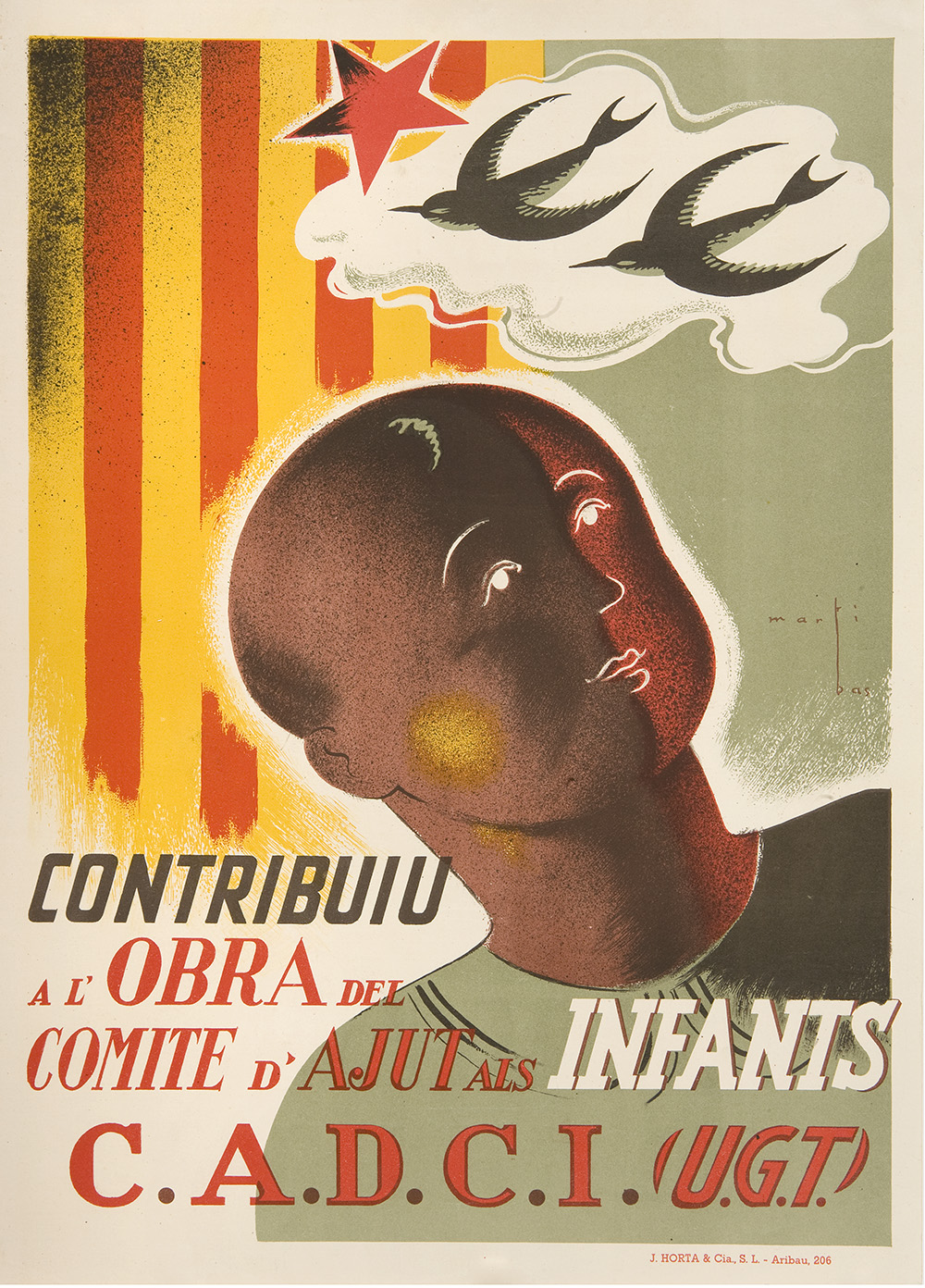 En una guerra, els nens són les primeres víctimes, les més innocents i desemparades i, com a tals, a més d’esdevenir símbol de la injustícia, han sigut font d’especial preocupació. Aquest cartell mostra una de les moltes iniciatives republicanes impulsades en plena Guerra Civil espanyola per ajudar la població infantil a través del Comitè d’ajut als infants del Centre Autonomista de Dependents del Comerç i la Indústria (CADCI), fundat el 1903. Conscient de la importància que el cartellisme va tenir com a arma de propaganda i mitjà de comunicació, Martí-Bas, un dels cartellistes republicans i antifeixistes més prolífics i implicats de la guerra, va dibuixar un nen que mira les orenetes al cel, que volen sobre un fons on es projecta la senyera estelada, per recaptar diners destinats a l’ajuda dels infants. Martí-Bas també va ser l’autor d’altres cartells com Treballadors de l’ensenyament. Per l’Escola Socialista! (1936) i Ajut infantil de rereguarda. Contribuiu-hi (1937), fets abans que fos expulsat, el gener de 1937, del Sindicat de Dibuixants Professionals.