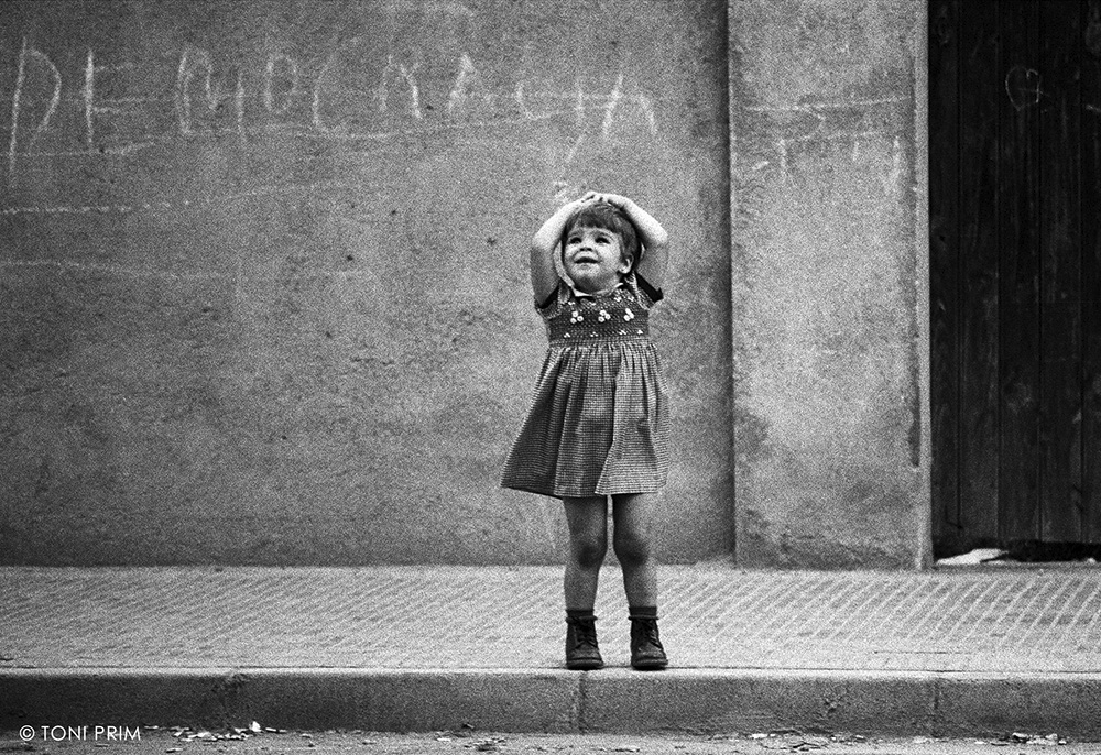 Corria l’any 1977 quan Toni Prim, reputat fotògraf lleidatà, va retratar aquesta nena solitària i somrient, de cara il·lusionada, davant d’un mur amb la paraula Democràcia. Tan sols feia dos anys que el dictador Franco havia mort i el país es trobava en plena transició democràtica, de tal manera que la mirada innocent i pura d’aquesta nena va ser captada per l’objectiu de Prim com un autèntic símbol dels anhels de canvi de la societat: els somnis de tota una generació en l’esguard pur i franc d’una nena.