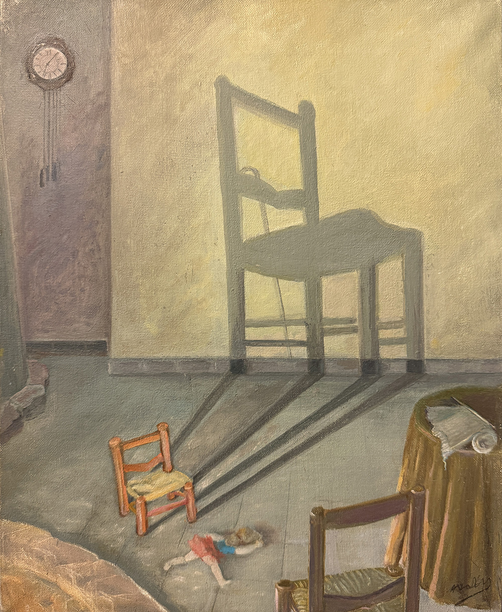Maria Lluïsa Malibarn va ser una de les moltes dones del segle XX que, pertanyent a una família culta i apassionada per l’art i la cultura, es va endinsar en la pràctica artística i la pintura des de la intimitat. Tot i que durant la postguerra va treballar com a modista, d’ella ens han arribat obres com aquesta escena simbòlica i melancòlica d’una dona que mira enrere cap a la infància, l’ombra de la qual es projecta ampliada i roman durant tota una vida. Malgrat els seus múltiples significats, sembla que, a través de la nina abandonada i el rellotge a la paret, Malibarn evoqui el pas del temps i el record d’una infància llunyana, sempre idealitzada com a temps feliç i paradís perdut que es projecta fins a l’adultesa, potser a manera de vanitas.