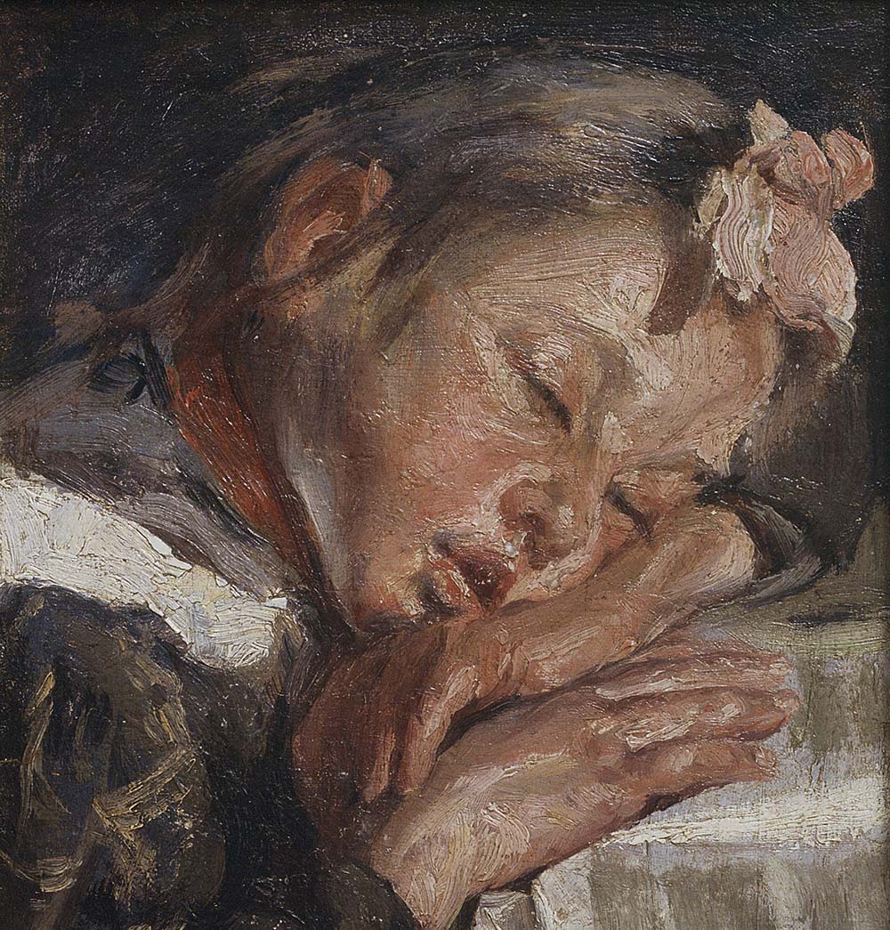 Francesc Gimeno va ser un dels pintors catalans més brillants del seu temps, per bé que va desenvolupar un llenguatge lliure allunyat de les tendències del modernisme, sovint dominat per una paleta de colors terrosos i una pinzellada ampla, solta i expressiva capaç de captar les vibracions més íntimes de la vida. La nena del quadre apareix cansada i rendida amb el cap i les mans tendres recolzades sobre les pàgines d’un llibre. Se’ns apareix somniant, abstreta del brogit del món, evocant una infància somniada i aliena al patiment.