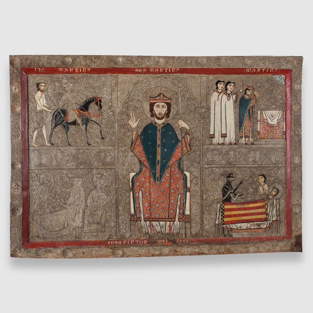Iohannes. Taller de la Ribagorça. Frontal d’altar de Gia, s. XIII. Tremp, relleus d’estuc i restes de full metàl·lic colrat sobre fusta, 100 x 146 x 8 cm. Núm. catàleg 003902-000. Museu Nacional d’Art de Catalunya.