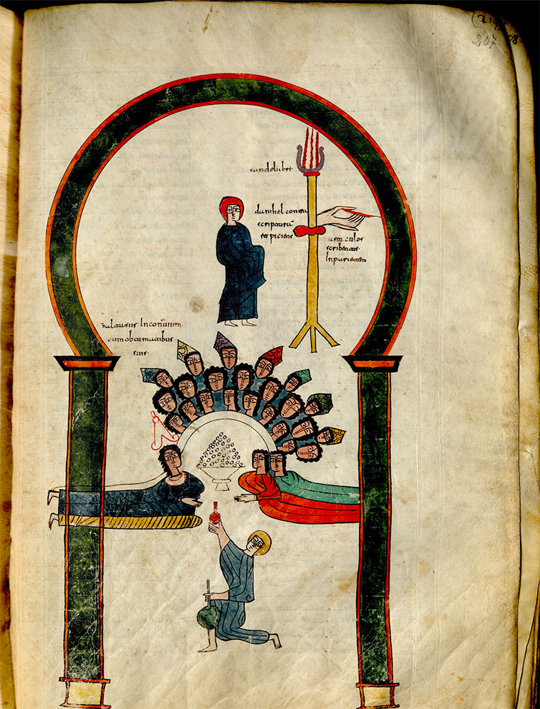 El Festí de Baltasar. Beatus de la Seu d’Urgell, s. X. Còdex anònim. F 219, núm. inventari 501. Museu Diocesà de la Seu d’Urgell.