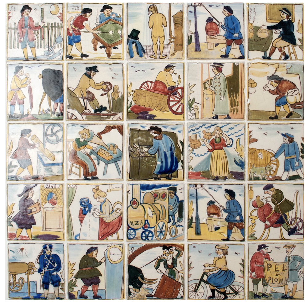 Anònim. Rajoles d’oficis, segle XVIII, Pisa. 53,5 x 40,5 cm. Núm. inventari: MEV 23914, 23916, 23918, 2643, 2641, 23913, 23917, 23912, 3174, 23919, 23920, 23915. Museu d’Art Medieval.